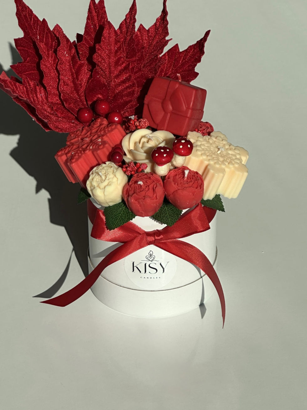 Елегантен коледен букет от ръчно изработени соеви свещи, създаден от 100% натурален соев восък и екологични материали. С внимание към детайла, той е идеалният избор за уютна атмосфера и нежна ароматерапия във вашия дом.