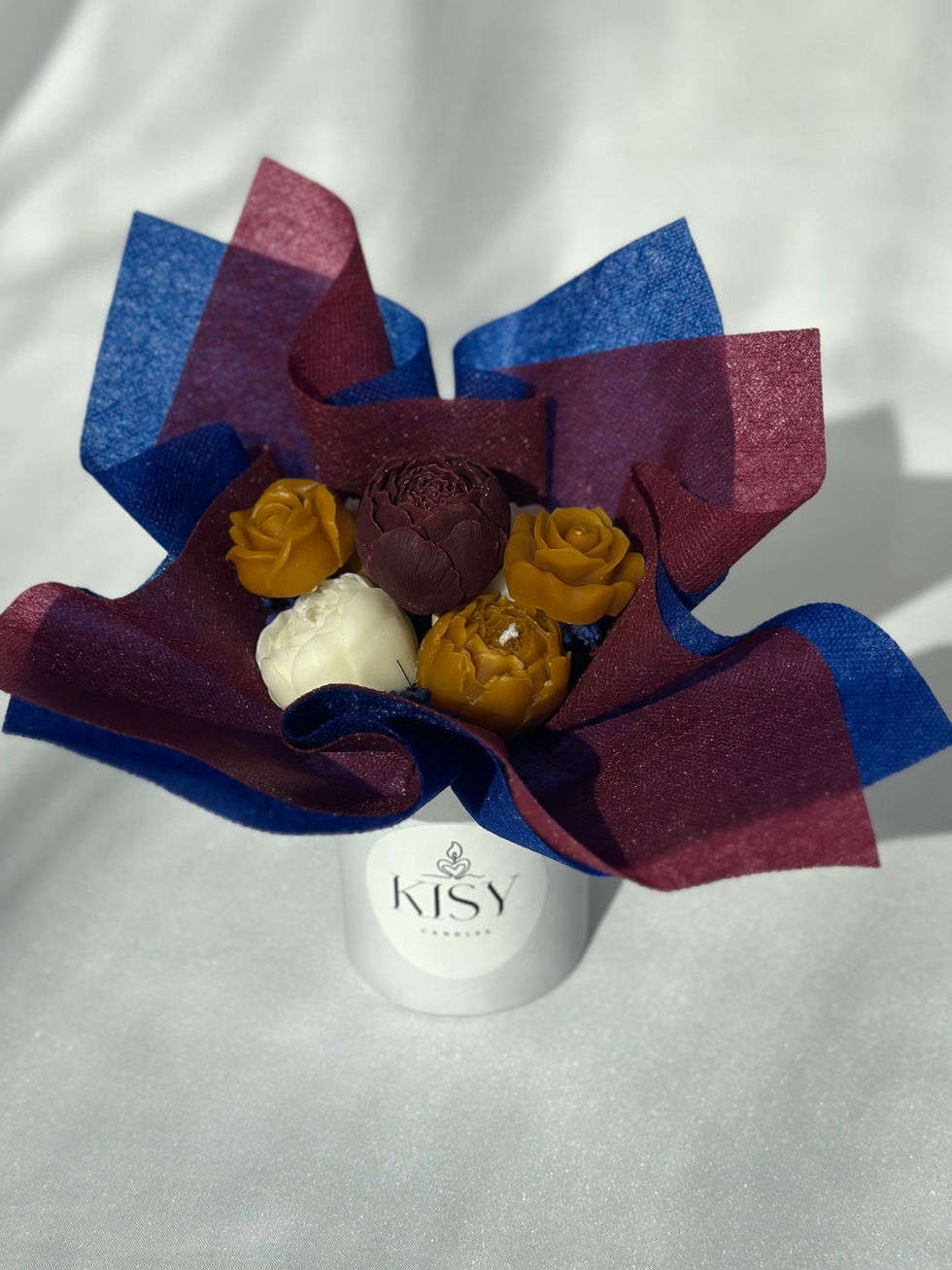 Елегантен букет от ръчно изработени соеви свещи, създаден от 100% натурален пчелен и соев восък и екологични материали. С внимание към детайла, той е идеалният избор за уютна атмосфера и нежна ароматерапия във вашия дом. Аромат: МЕД. Размери: 10х10х20 см. Време за изработка: 1-3 работни дни. Свещите могат да се използват след отстраняване на всички сухи декорации.