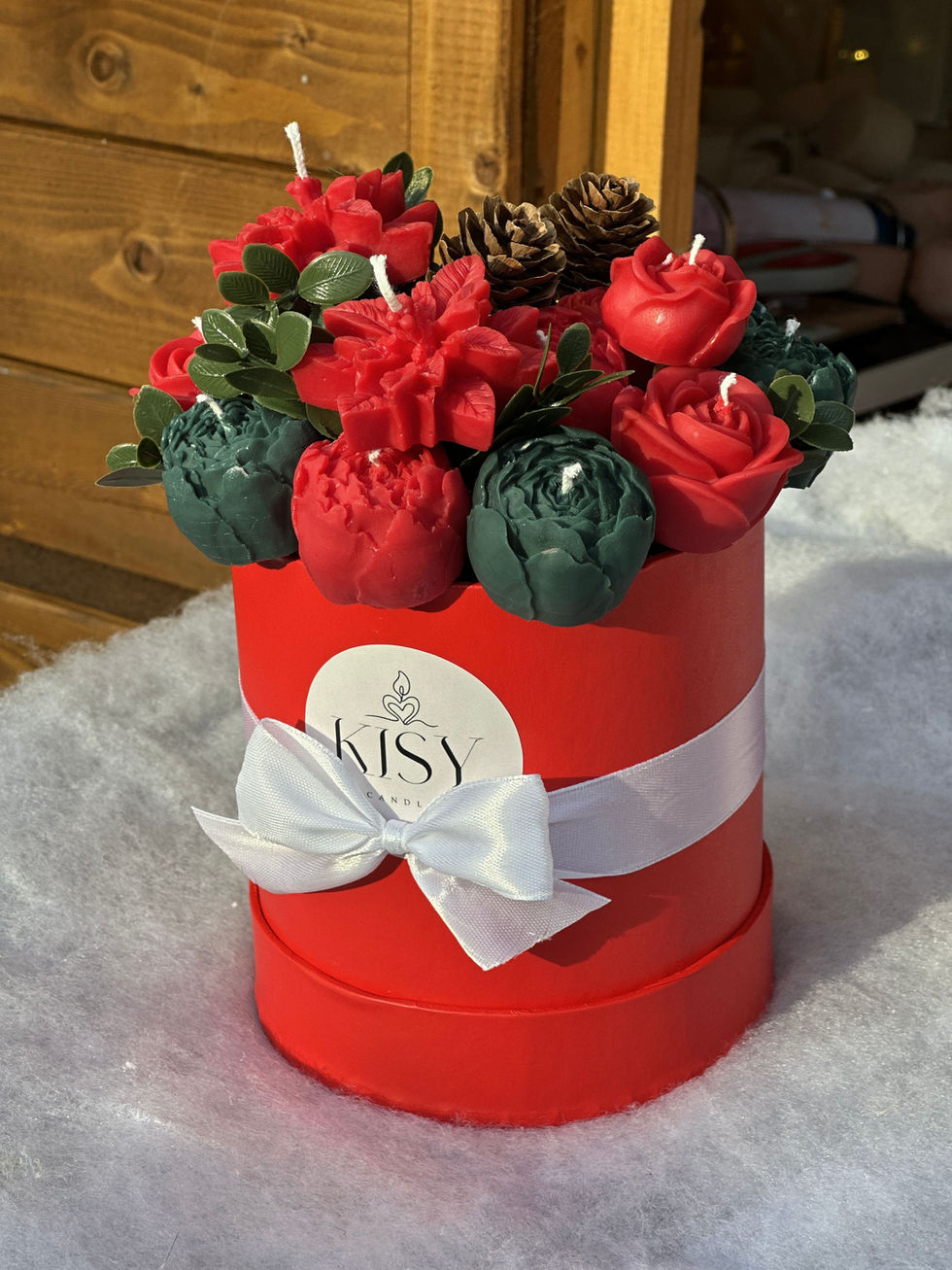 Елегантен коледен букет от ръчно изработени соеви св ещи, създаден от 100% натурален соев восък и екологични материали. С внимание към детайла, той е идеалният избор за уютна атмосфера и нежна ароматерапия във вашия дом.